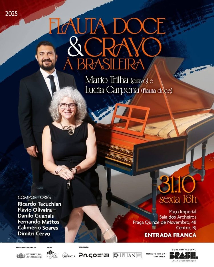 A Sala dos Archeiros do Paço Imperial do Rio de Janeiro viveu, dia 31 de outubro, uma tarde memorável de flauta doce e cravo com a perfeita apresentação de Mario Trilha e Lucia Carpena. O espaço não podia ser o mais adequado, pelo seu significado histórico, por conta da época de sua construção, 1738-1743, que foi frequentado pelo compositor Padre José Maurício Nunes Garcia. Também, pela excelência de sua acústica. As obras executadas foram de compositores brasileiros contemporâneos como Vilani Cortes, Flávio Oliveira, Danilo Guanais, Fernando Mattos, Calimério Soares e Dmitri Cervo. Destaque para o compositor Ricardo Tacuchian que estava presente e aplaudiu a estreia mundial de sua obra “Cravo e Canela” e também “Arabescos”, que dedicou ao cravista Mário Trilha.
