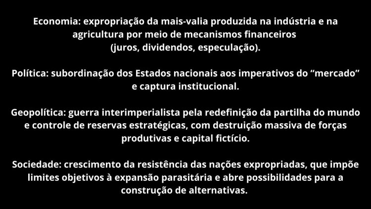 “A guerra imperialista é a continuação da política de financeirização por outros meios: onde a concorrência econômica já não basta para redefinir a partilha do mundo, a força bruta decide quem fica com os ativos sólidos e quem herda os papéis podres.”