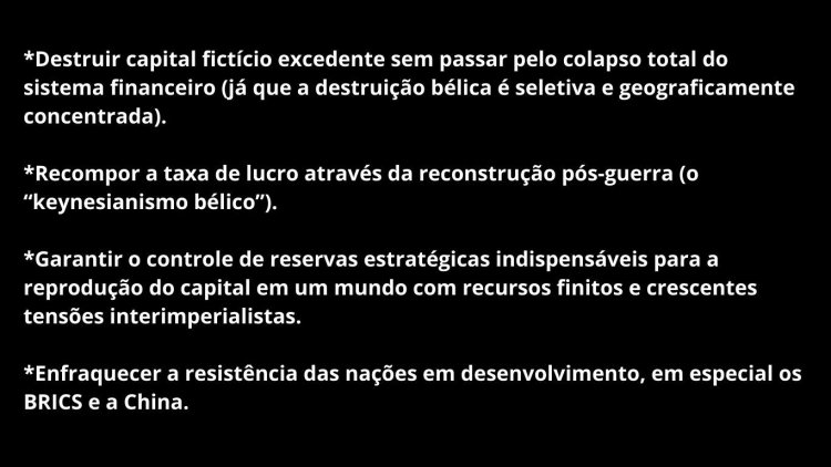Função: destruir forças produtivas excedentes e capital fictício “podre” para recompor a taxa de lucro e redefinir, pela força, quem controla reservas estratégicas.