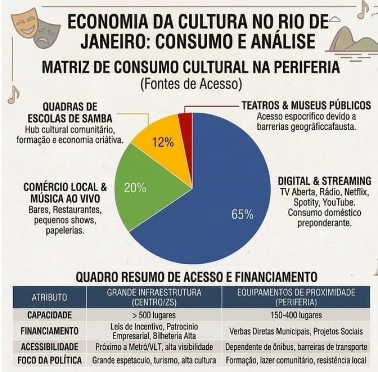 O IBGE tem indicadores sobre essas infraestruturas e desigualdades no Sistema de Informações e Indicadores Culturais (SIIC) e na pesquisa MUNICIPAL. O cenário do Rio de Janeiro apresenta as seguintes características. A cidade possui a maior proporção de unidades locais do setor cultural do país (8%), mas a maioria está sediada no Centro da cidade e na Zona Sul. A média estadual de deslocamento para teatros ou museus é de 16 minutos, mas esse dado mascara a realidade das favelas e subúrbios, onde o tempo de transporte público para o Centro pode superar 90 minutos. O uso do celular é quase universal para o consumo de conteúdo (98,9% dos usuários de internet), reforçando a cultura digital na ausência de teatros físicos próximos. O setor cultural formal exige alta escolaridade (32% com nível superior), o que muitas vezes cria uma barreira de entrada para trabalhadores da periferia em cargos de gestão nessas políticas empresariais e públicas. Essas disparidades na distribuição de recursos não apenas limita o acesso à fruição artística, mas também restringe o potencial de crescimento da Economia da Cultura local, que hoje encontra nas quadras das escolas de samba e nos comércios de bairro sua principal rede de sustentação.
