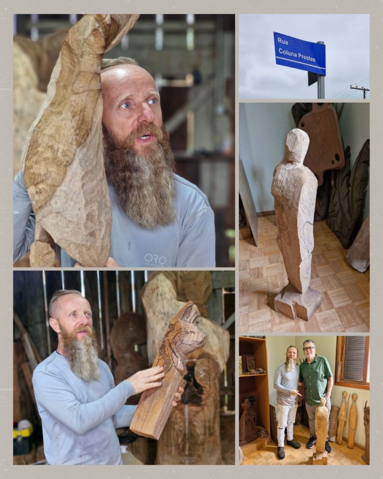 Ao me hospedar no Hotel Descanso, pude conferir e admirar o mural dedicado a marcha, realizado por Neuri Jorge Reolon, também autor do mural da fachada do Centro Cultural Coluna Prestes, que guarda documentos e objetos relacionado a fundação da cidade. Claro, fiz questão de visitar o ateliê do artista onde conferi sua versatilidade e erudição. Além de muralista, ele é o poeta da pedra, do metal e da madeira. Quando ele me disse que ao ver o tronco de uma árvore caido na floresta imediatamente visualiza quem está dentro dela anotei: