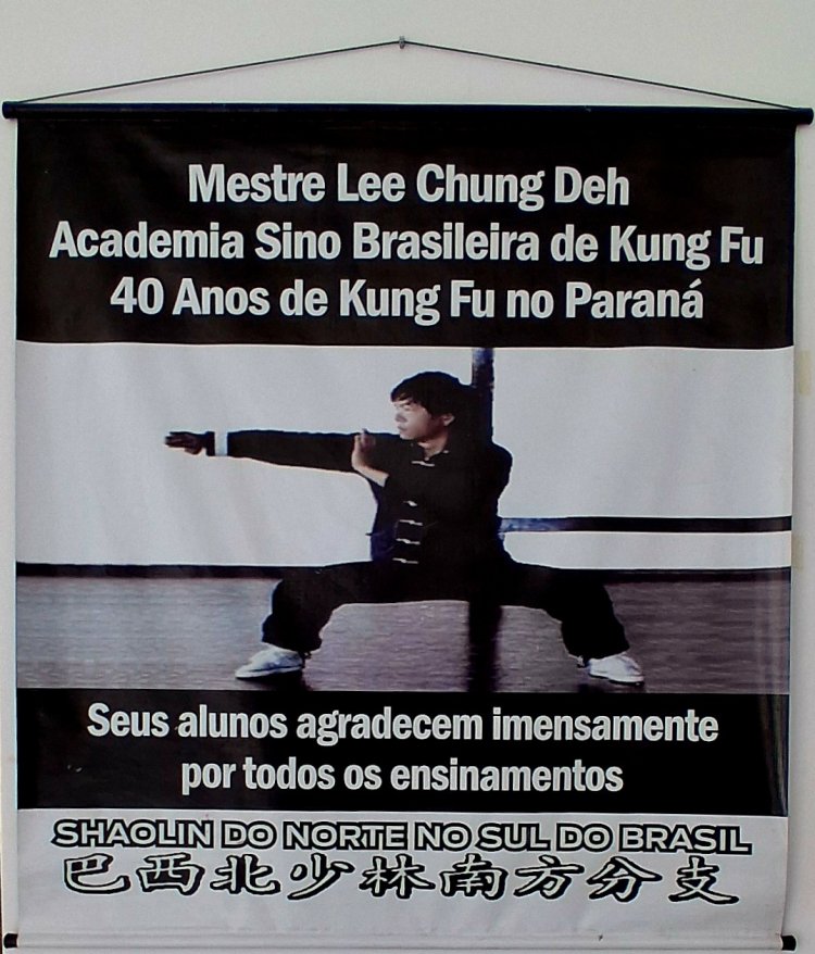 Banner comemorativo de 40 anos de fundação do Kung Fu em Curitiba, academia Academia Bei Long.